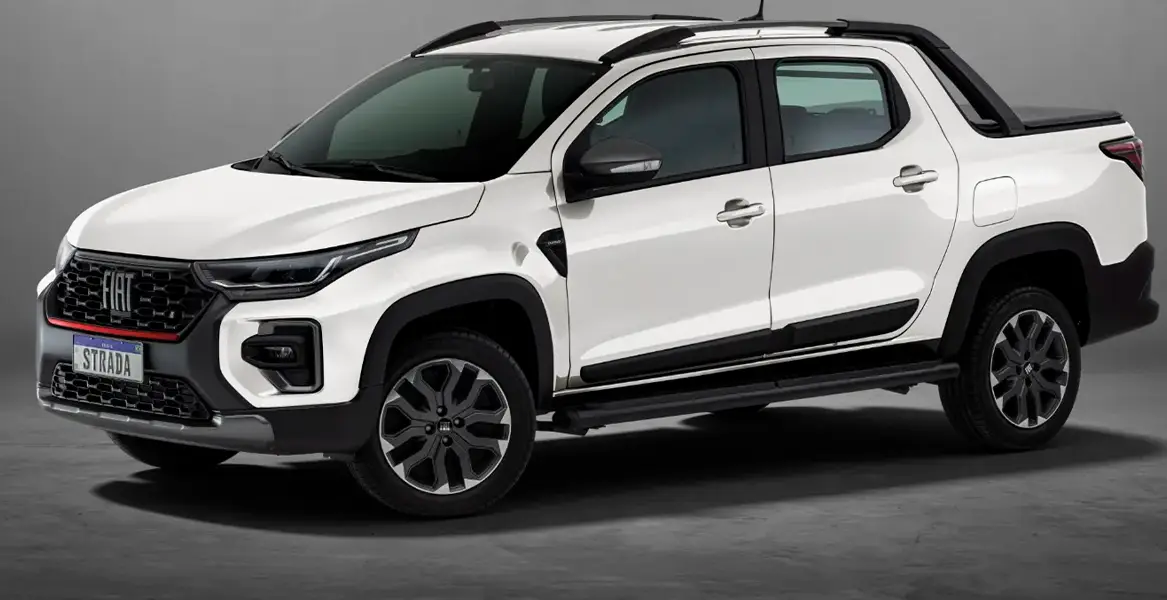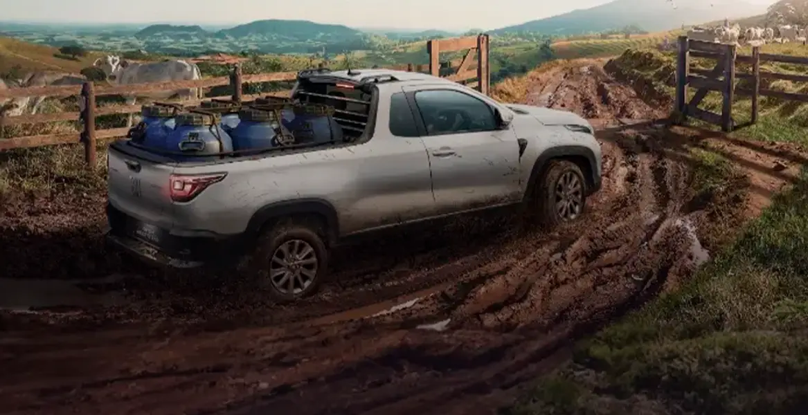 Com barras de teto na cor cinza, retrovisor preto brilhante, estribo lateral e badges externos, o modelo Ranch da Fiat Strada está belíssimo também por fora.